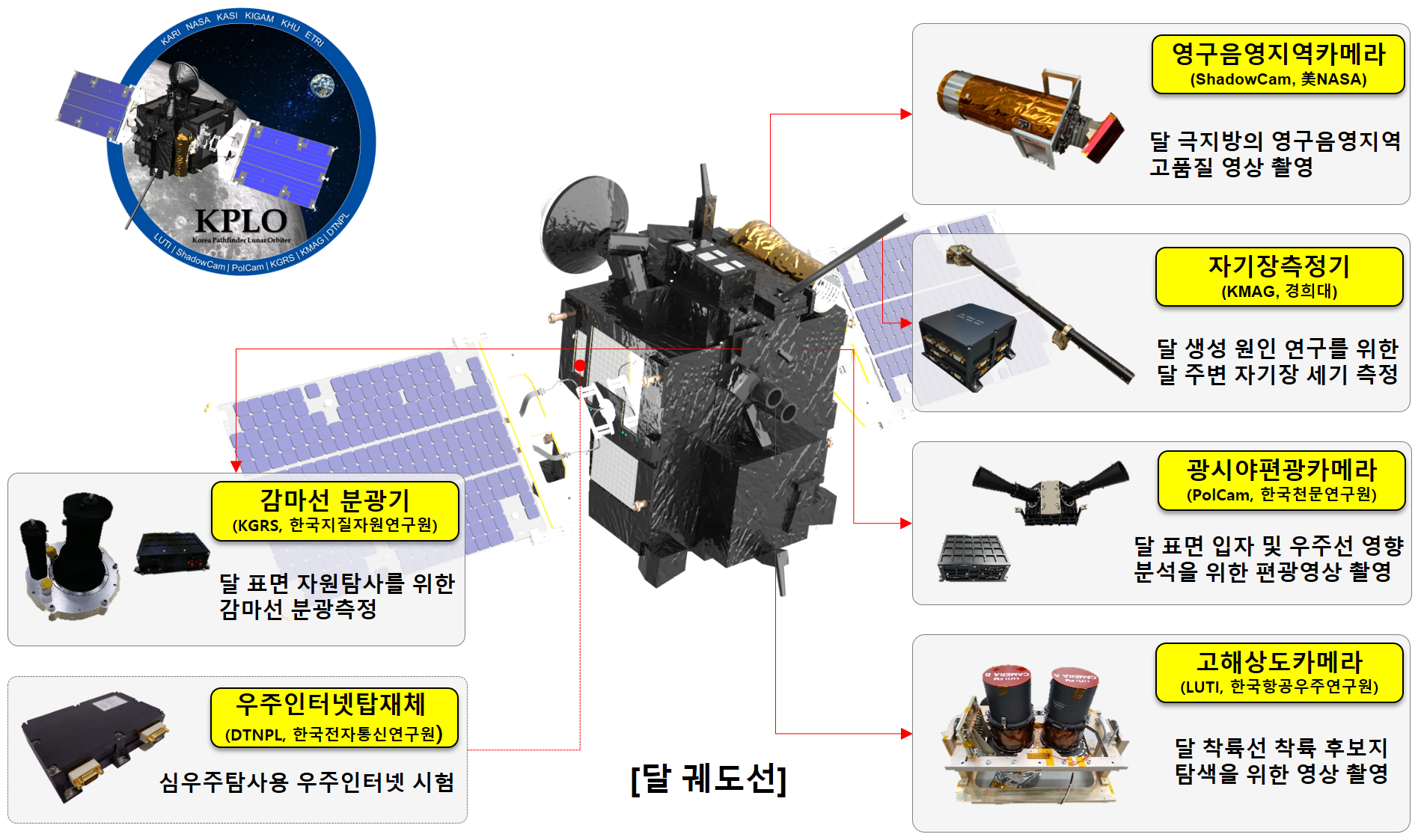 다누리의 제원은 발사형상 체적이 1.82m(가로)×2.14m(세로)×2.29m(높이)이며, 궤도형상 체적은 6.30m(가로)×3.18m(세로)×2.67m(높이)에 총 중량은 678kg(연료 260kg 포함)입니다. 또한 탑재체의 기능을 지원하는 본체와 궤도선 고유의 임무를 수행하는6개의 탑재체(총 34.2kg)로 구성되어 있습니다.